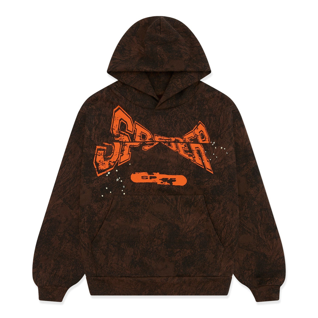 13oz, 100% cotton fleece. Puff print / discharge print combination. Tree camo design. T&F 'SP5DER' text...